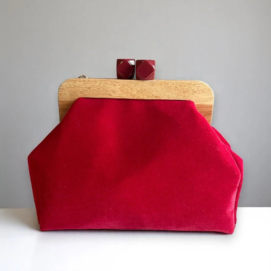 Red Velvet Clutch – Handmade Wooden Frame Purse with Geometric Clasp | Bold Evening Bag