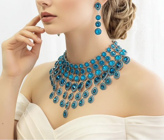 Turquoise Statement Necklace - Chunky Jewelry Set With Crystal Earrings | Luxury Silver-Tone