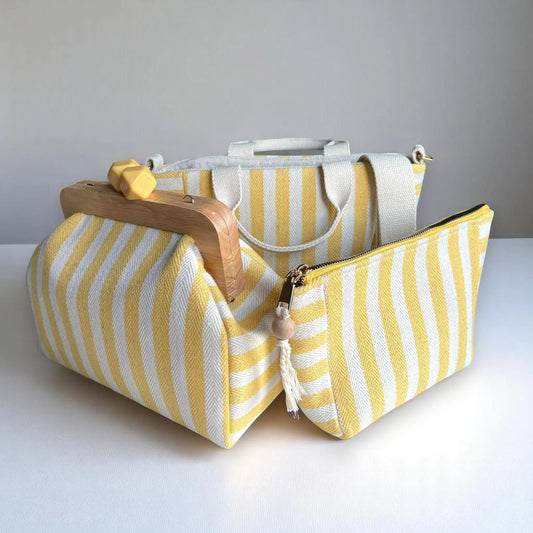Yellow Striped Bag Set - Handmade Tote Bag, Wood Frame Clutch & Zipper Pouch