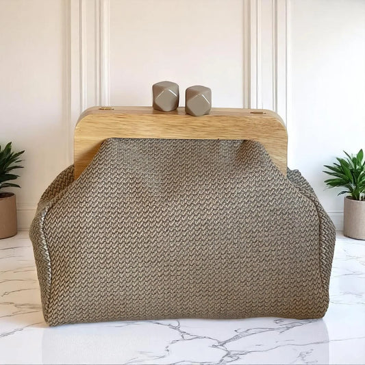 Woven Clutch Bag – Handmade Beige Purse with Wooden Frame & Marble Beaded Handle