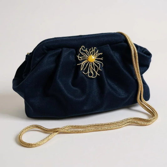 Velvet Evening Clutch – Black Handmade Bag with Gold Floral Brooch & Chain Strap
