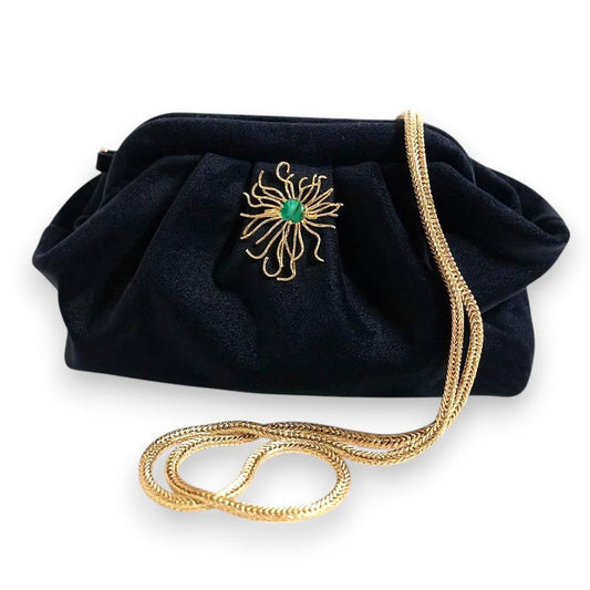 Velvet Clutch Bag – Handmade Black Velvet Evening Purse with Gold Floral Brooch