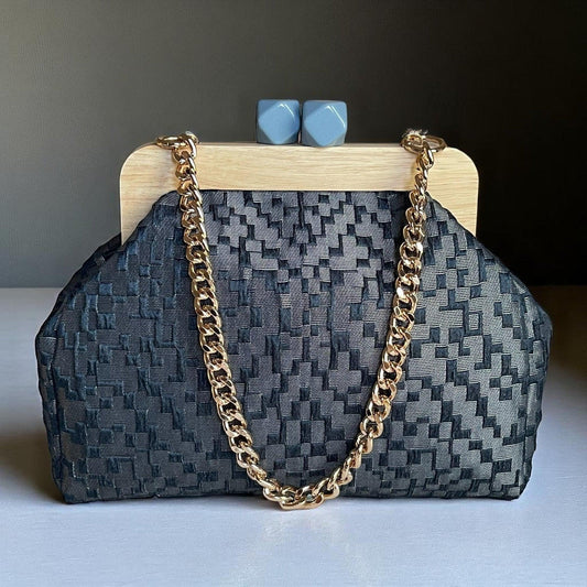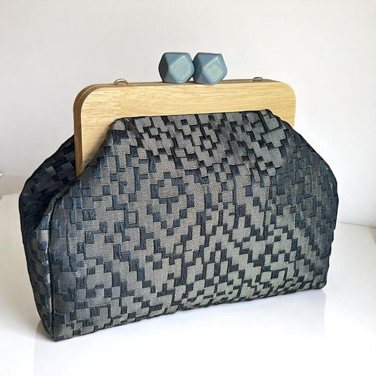 Textured Evening Clutch – Handmade Woven Clutch Bag with Wooden Frame & Blue Beaded Handle