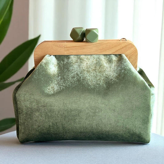 Olive Green Clutch – Handmade Velvet Evening Bag with Wooden Frame & Sculptural Clasp