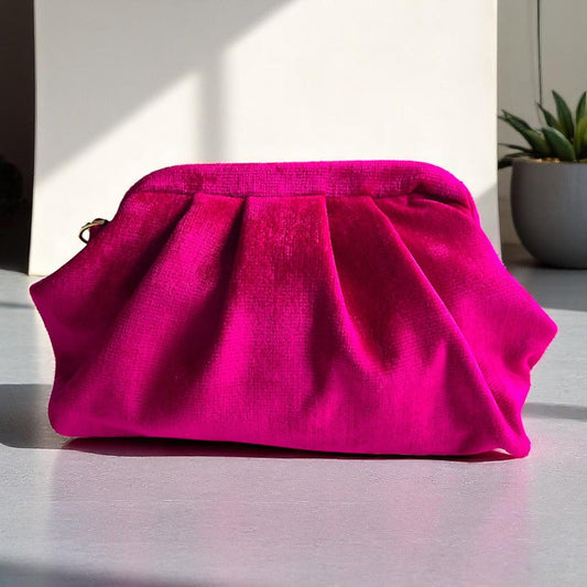 Hot Pink Velvet Clutch with Beaded Handle | Handmade Gold Chain Evening Bag | Statement Purse for Parties & Events