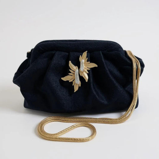Black Velvet Evening Clutch with Gold Chain & Baroque Pearl Brooch โ Elegant Handmade Purse for Weddings, Formal Events โ