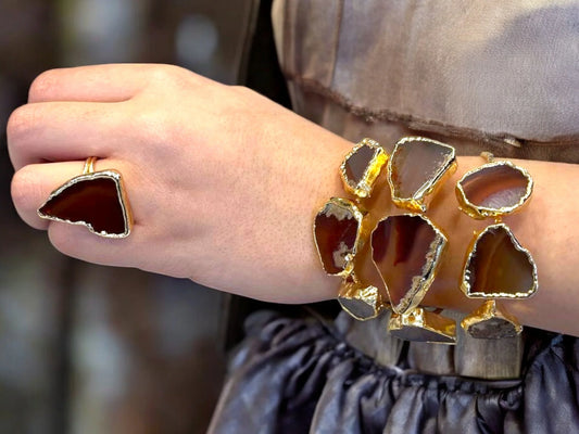 Gold Plated Agate Cuff | Statement Jewelry Set With Handmade Agate Ring & Bold Design