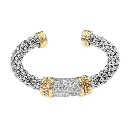 CZ Stone Paved Bar Accent Two Tone Braided Cuff Bracelet