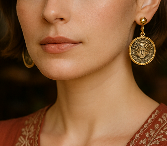 Ancient Coin Statement Earrings – Gold Framed Vintage Design