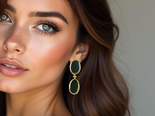 18K Gold Plated Handmade Minimalist Green Oval Gemstone Drop Earrings, Made in Turkey