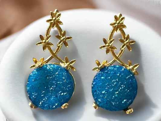 Handmade 18K Gold Plated Druzy Stone Minimalist Floral Vine Earrings, Made in Turkey
