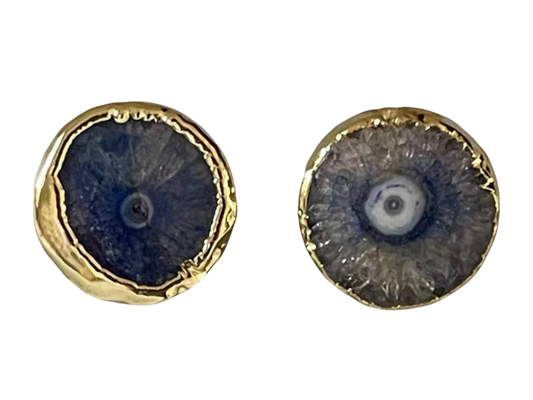 Gold Plated Blue Geode Stud Earrings - Handmade Green Natural Stone Boho Chic Jewelry, Handmade In Turkey