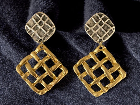 18K Gold-Plated Two-Tone Geometric Dangle Earrings - Handmade Artisan Jewelry, Handmade In Turkey