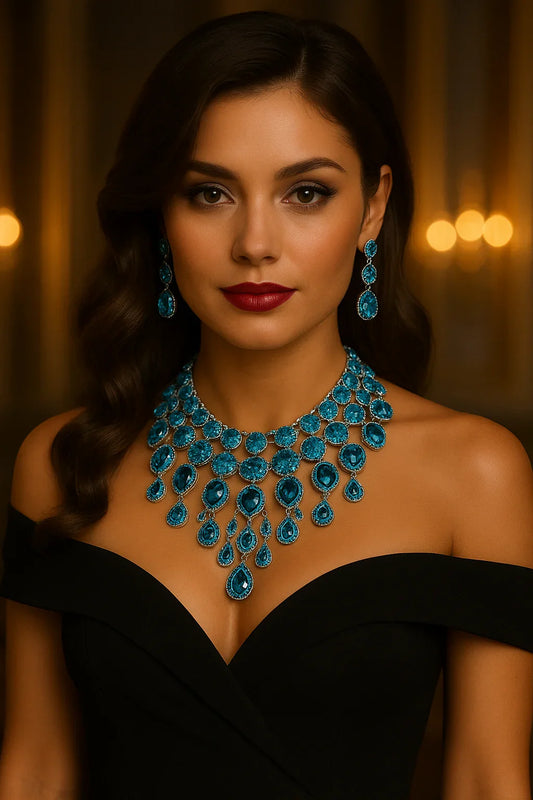 Rose Gold Statement Necklace – Chunky Jewelry Set With Turquoise Crystals & Long Drop Earrings