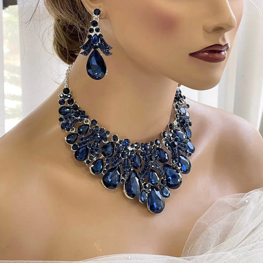 Blue Teardrop Necklace – Evening Jewelry Set With Adjustable Collar & Earrings