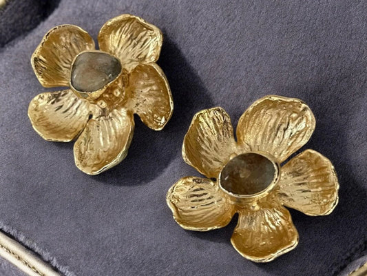 Gold Plated Stud Earrings – Handmade Floral Agate Stone Earrings with Chunky Flower Design
