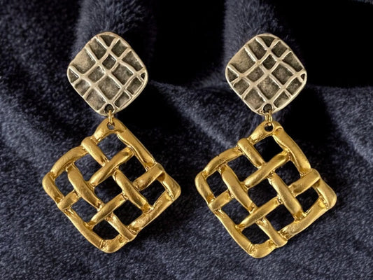 Gold Plated Earrings - Handmade Two Tone Geometric Dangle Earrings | Lightweight Artisan Jewelry