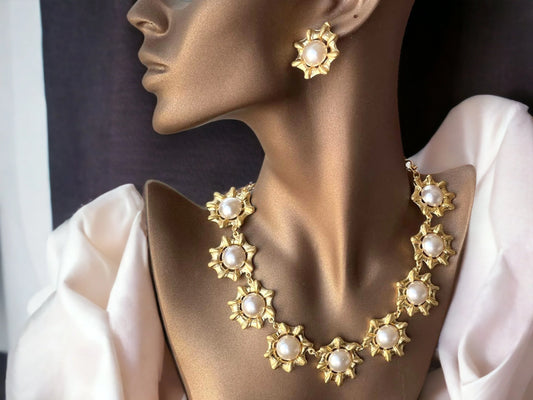 Elegant Gold and Pearl Statement Necklace and Earrings Jewelry Set