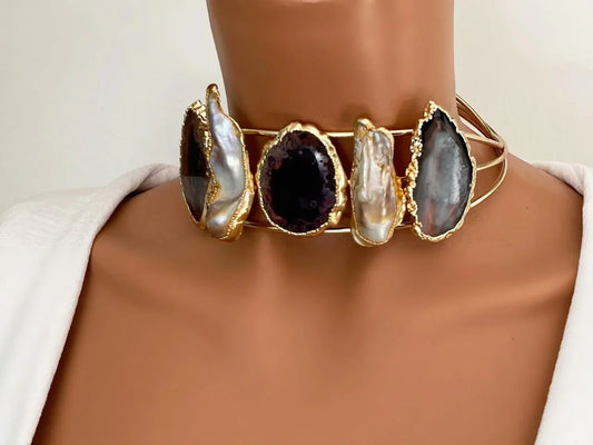 Gold Plated Choker – Handmade Baroque Pearl Necklace With Druzy Gemstone Stars