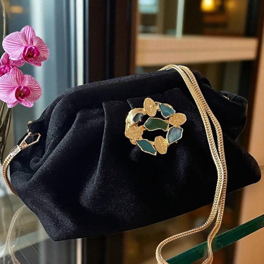 Black Velvet Evening Clutch with Gold Leaf & Green Stone Accent