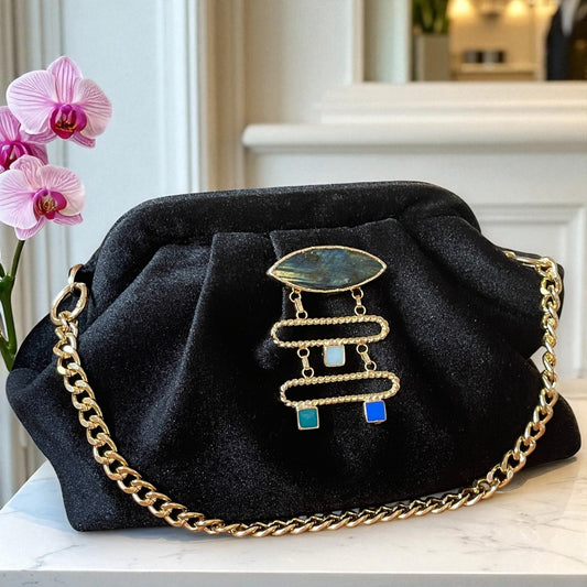 Velvet Black Evening Clutch with Gold Chain & Gemstone Accent