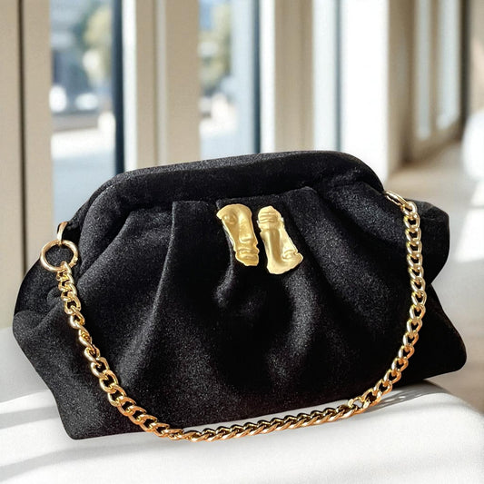 Black Velvet Clutch with Gold Face Accent & Chain Strap