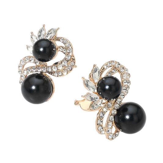 Double Pearl Accent Rhinestone Pave Swirl Clip On Earrings