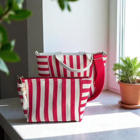 Striped Canvas Bag Set – Cotton Tote, Handmade Clutch Purse & Zippered Pouch with Tassel