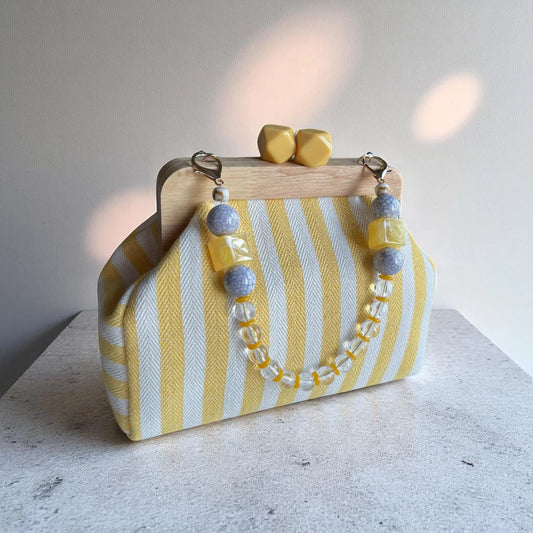 Handmade Canvas Clutch - Yellow Striped Purse with Wooden Frame & Pyramid Clasp