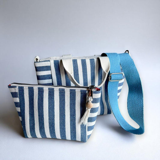 Handmade Canvas Tote - Blue White Bag Set | Wood Frame Clutch & Zipper Pouch
