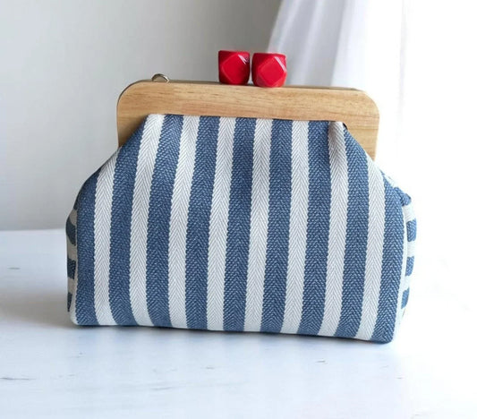 Striped Canvas Clutch – Handmade Bag with Wooden Frame & Pyramid Clasp Closure