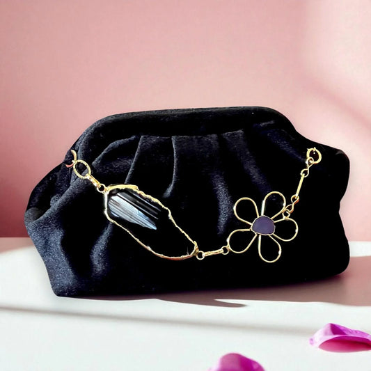 Black Velvet Clutch – Handmade Evening Bag with Gold Chain & Floral Gemstone Accent