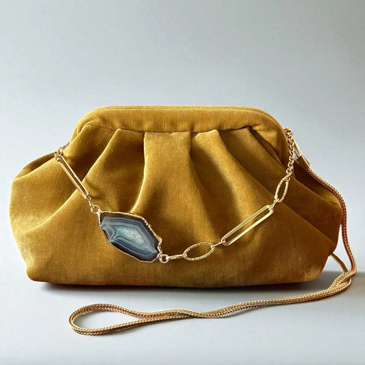 Mustard Velvet Clutch – Handmade Boho Chic Purse with Agate Stone & Gold Plated Chain