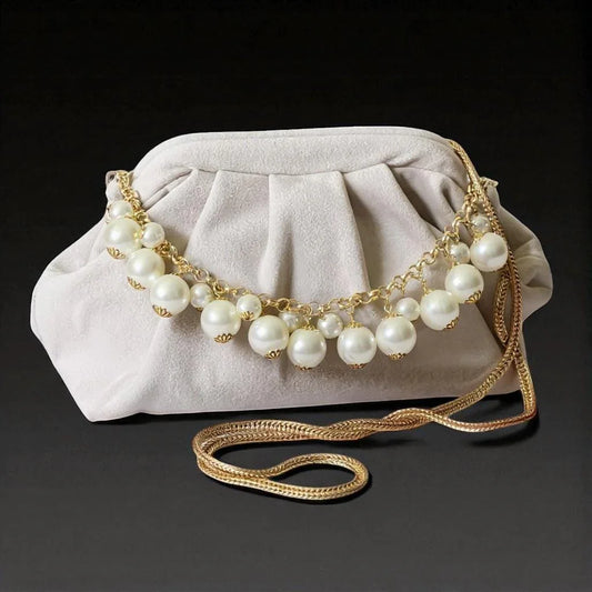 Ivory Velvet Clutch – Handmade Purse with Pearl Chain & Gold Strap, Elegant Bridal Evening Bag