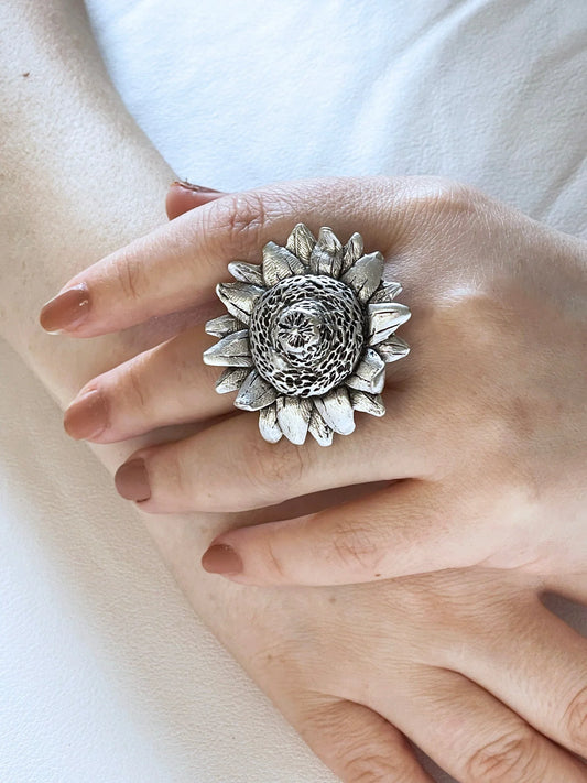 Silver Plated Chunky Ring – Adjustable Sunflower Big Ring | Handmade Boho Jewelry Gift