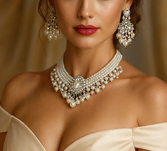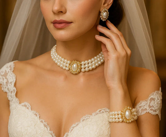 Victorian Pearl Choker - Elegant Bridal Jewelry Set | Adjustable Necklace, Stud Earrings & Pearl Bracelet