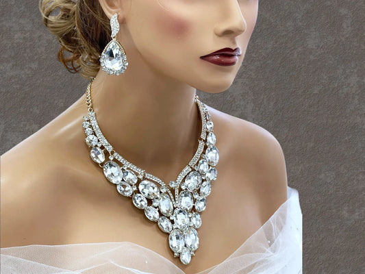Crystal Statement Necklace - Bridal Jewelry Set With Teardrop Earrings, Adjustable Length