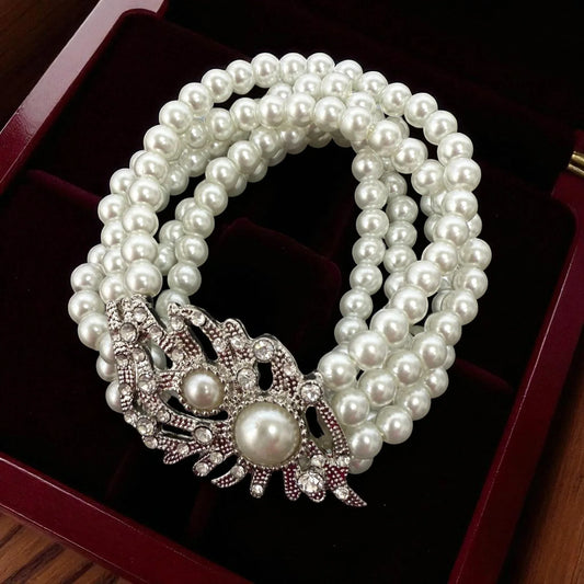 Multi Strand Pearl Bracelet – Elegant Stretch Pearl Jewelry with Crystal Clasp