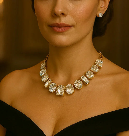 Luxury Crystal Necklace – Statement Set with Gold Tone Chain & Stud Earrings