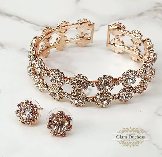 Crystal Flower Bracelet – Elegant Rose Gold Bridal Jewelry Set With Stud Earrings