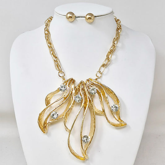 Stone Accent Resin Metal Cutout Floral Link Statement Necklace Earrings Set