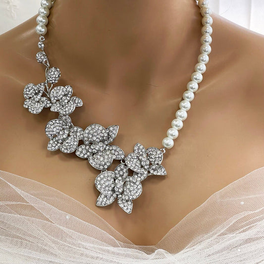 Bridal Jewelry Set - Statement Earrings and Necklace with Crystal Pearl Orchid Flowers
