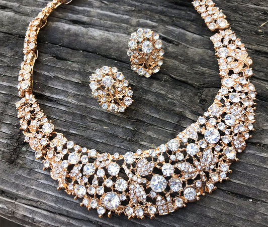 Gold Rhinestone Bridal Jewelry Set - Chunky Statement Necklace Earrings Bracelet