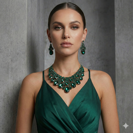 Emerald Green Necklace – Adjustable Collar Necklace Set with Teardrop Stone Earrings
