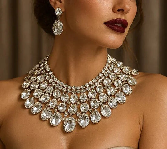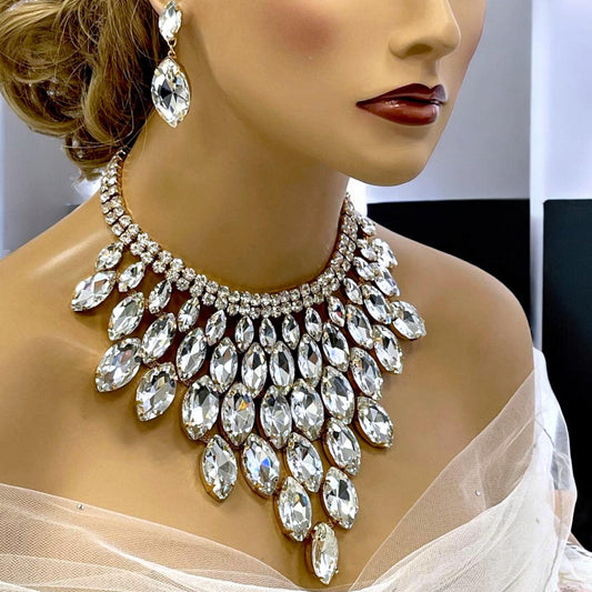 Chunky Crystal Necklace - Statement Bib Necklace with Sparkling Earrings Set