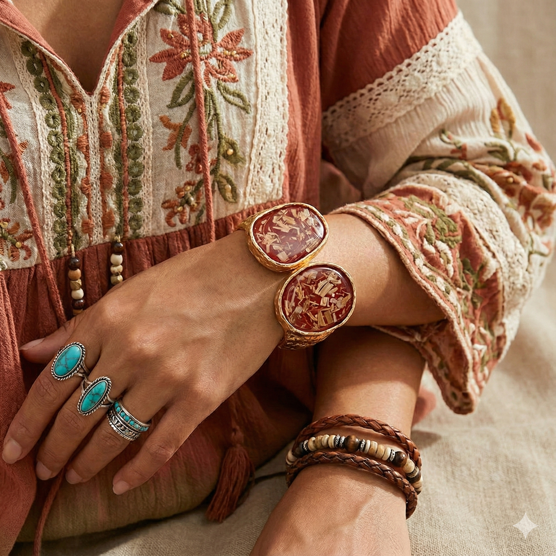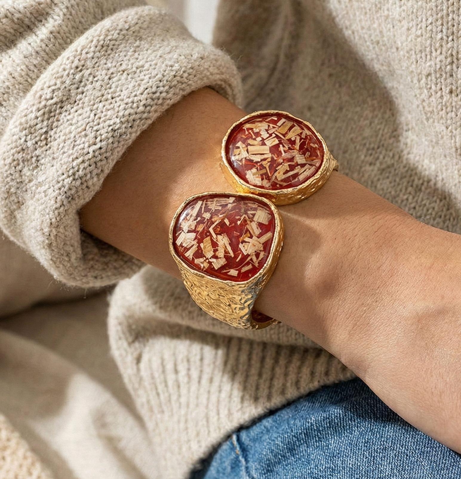 • Bold cuff bracelet with dual round resin inlays and textured finish, offering a unique and modern look for standout accessorizing.