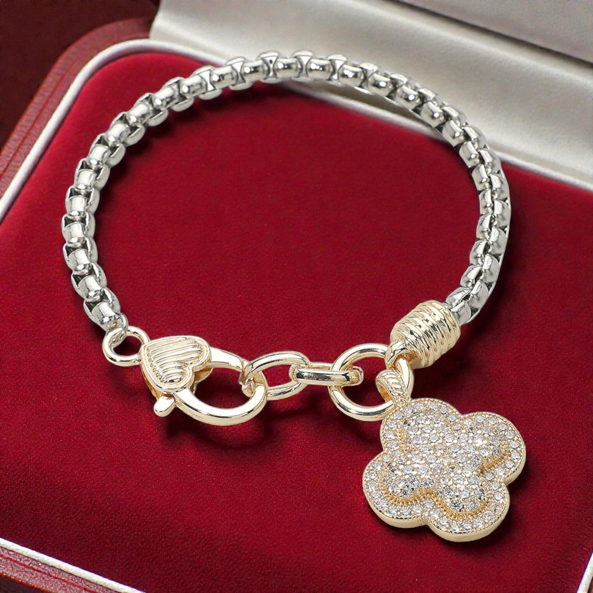 • Stylish chain bracelet featuring a shimmering crystal clover charm and heart clasp. A perfect mix of elegance and charm for everyday wear or special occasions.
