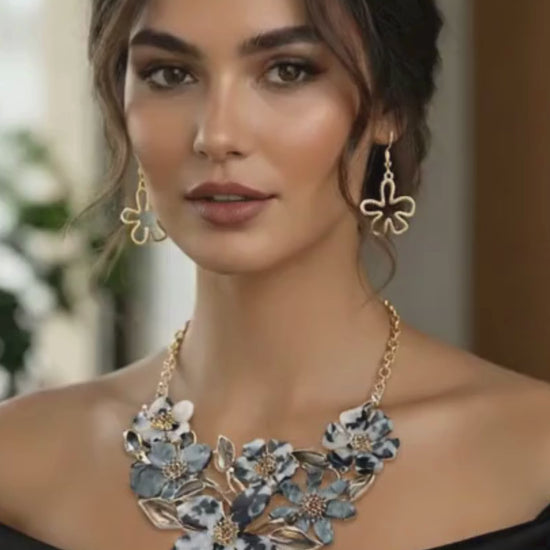 • This floral statement necklace and earring set showcases beautifully layered petals and delicate leaf accents, creating a bold yet elegant look. Perfect for special occasions or evening events, this coordinated set adds a sophisticated, feminine charm that enhances any ensemble.